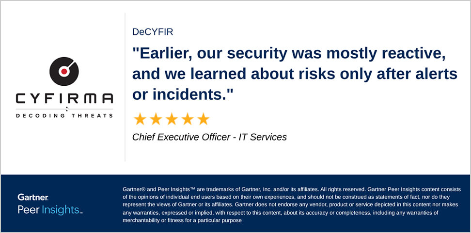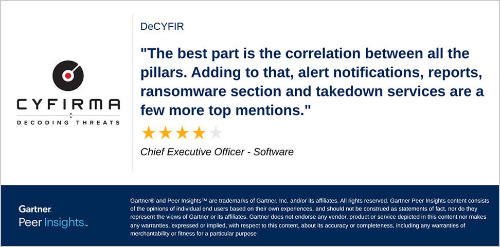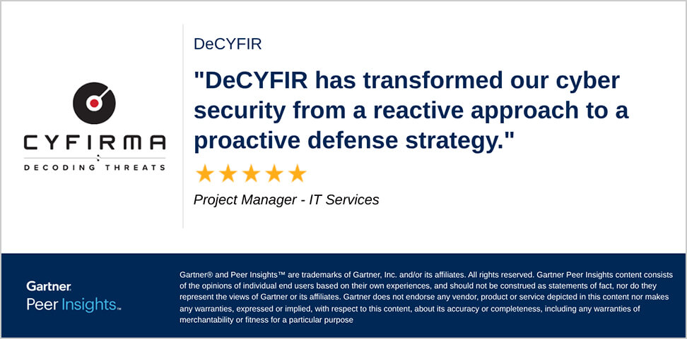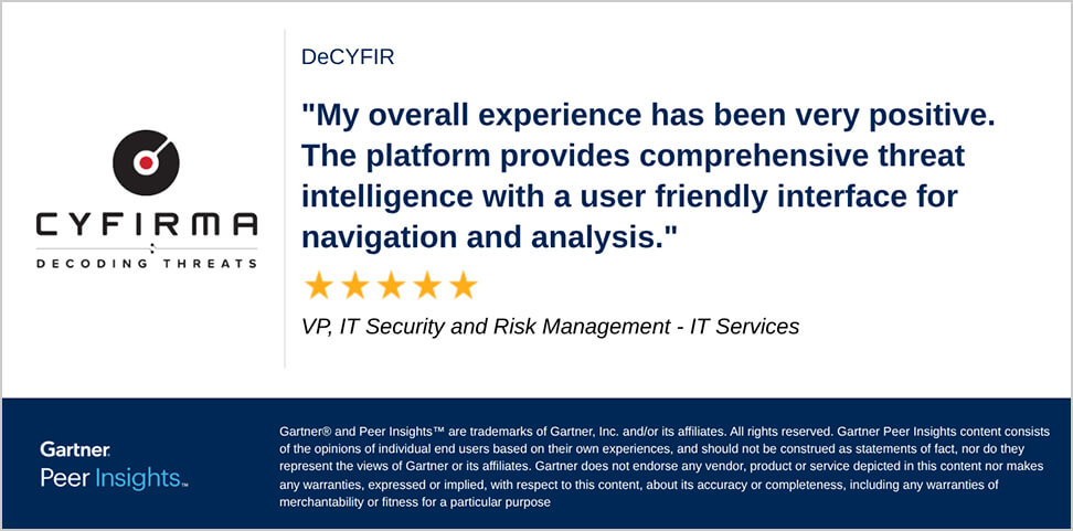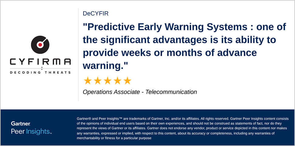 Learn more Get startedCYFIRMA saw the need for defenders to think differently about threat intelligence, beyond generic data feeds that only add noise to telemetry systems. We understand you need to establish a deeper visibility across your entire digital footprint, so you can quickly identify, and address threats, moving from reactive to PROACTIVE.