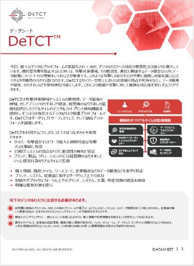 デジタルトランスフォーメーションによりデジタルリスクは加速度的に増大しサイバーセキュリティ責任者は攻撃対象となったデジタルフットプリントの発見という難題に直面しています。デジタル流出リスクの検知速度が自社ブランドや評判、財務状況への損失や影響度を大きく左右するといえます。CYFIRMA提供のDeTCTでこうした被害や損害を最小限化することができます。