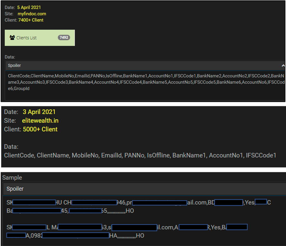 Summary: Details of approximately 7,400 and 5,000 clients of myfindoc.com, elitewealth.in respectively have been observed to be advertised for sale by unknown threat actors in the underground forums. The leaked records include personally identifiable information (PII) such as client name, mobile number, email address, PAN (Permanent Account Number), and other financial information related to the affected client.