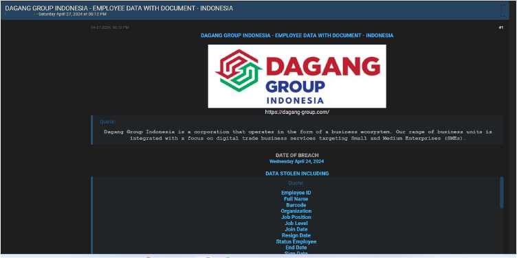The CYFIRMA Research team observed a potential data leak related to DAGANG GROUP INDONESIA, {www[.]dagang-group[.]com } in an underground forum. Dagang Group Indonesia is a corporation that operates in the form of a business ecosystem. Dagang Group Indonesia’s range of business units is integrated with a focus on digital trade business services targeting Small and Medium Enterprises (SMEs). The compromised data encompasses a range of sensitive information, including employee details such as Employee ID, full name, barcode, organizational affiliation, job position, level, join and resign dates, employee status, end dates, sign dates, and other confidential data points. The data breach has been attributed to a threat actor identified as ‘Sedapmalam’.