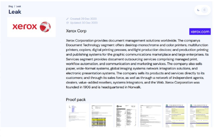 The INC RANSOM ransomware group claims to have hacked the American multinational corporation Xerox Corp. The latter delivers document management solutions on a global scale. Within its Document Technology segment, the company provides an array of products, including desktop monochrome and color printers, multifunction printers, copiers, digital printing presses, and light production devices. Additionally, Xerox offers advanced production printing and publishing systems tailored for both the graphic communications marketplace and large enterprises. The INC RANSOM group added Xerox to the list of victims on its Tor leak site. The ransomware group published the images of eight documents, including emails and an invoice, as proof of the hack.