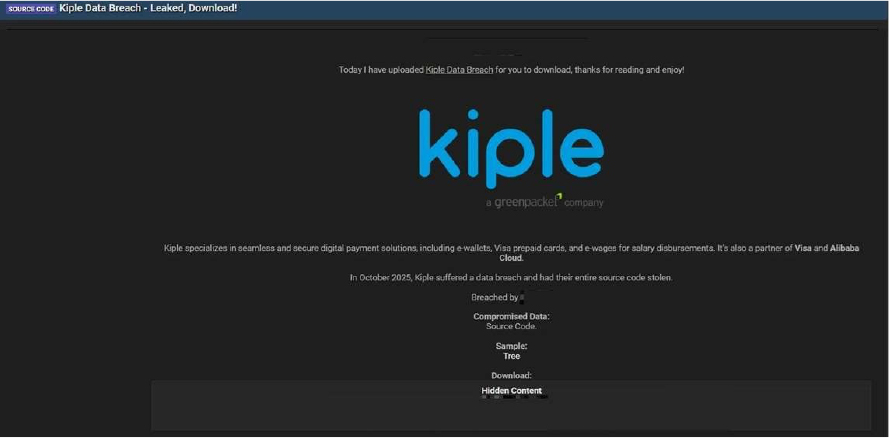 The CYFIRMA Research team observed that a threat actor “888” claims to have breached Kiple, a Malaysian company specializing in digital payment solutions. According to a post on a dark web forum, the incident occurred in October 2025, resulting in the theft of the company’s source code. Kiple, a Greenpacket company, provides services including e-wallets, Visa prepaid cards, and e-wages for salary disbursements, and is a partner of Visa and Alibaba Cloud. The leak appears to encompass a wide range of the company’s internal and external-facing projects.