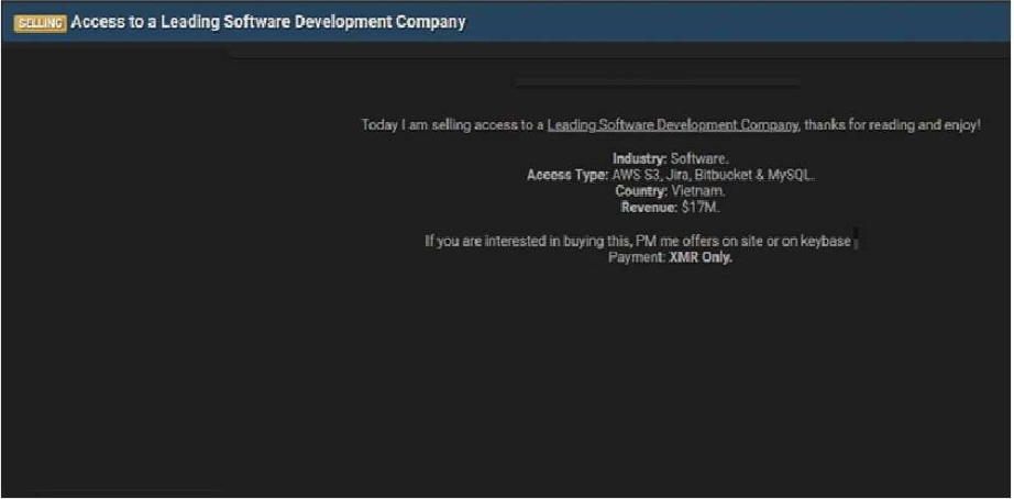 The CYFIRMA Research team observed that a threat actor is selling network access to a leading software development company based in Vietnam. The company is reported to have an annual revenue of $17 million.