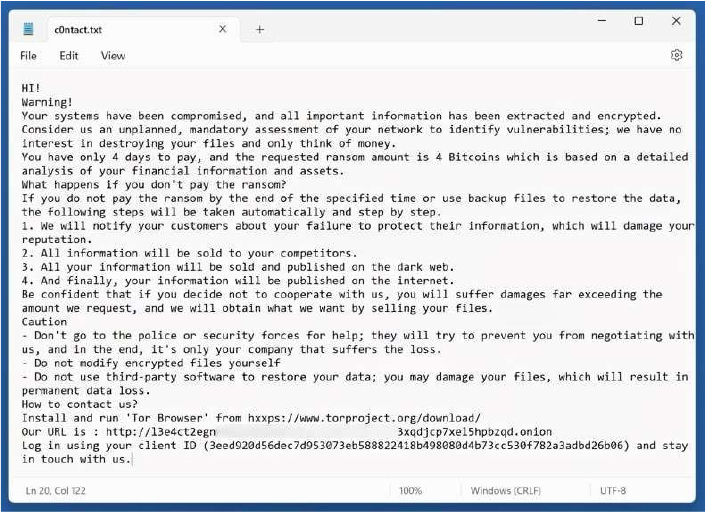 The ransom notes contained in c0ntact.txt informs the victim that their network has been compromised, with both encryption and data exfiltration carried out during the attack. It states that the attackers demand 4 Bitcoin as payment, giving the victim a four-day deadline. The message outlines a sequence of consequences if the ransom is not met notifying customers of the breach, selling the stolen data to competitors, publishing it on the dark web, and eventually releasing it openly online. The note also includes explicit warnings against contacting law enforcement, using third-party recovery tools, or attempting manual decryption, claiming that such actions could result in permanent data loss. Victims are directed to use the Tor Browser to access a provided onion URL, where they are instructed to log in with a client ID to initiate communication with the attackers.
