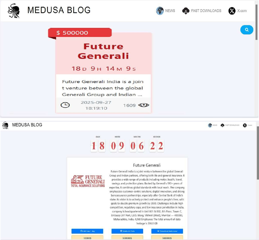 From the External Threat Landscape Management (ETLM) Perspective, CYFIRMA observed in an underground forum that a company from India, Future Generali(https[:]//online[.]futuregenerali[.]in/), was compromised by Medusa Ransomware. Future Generali India is a joint venture between the global Generali Group and Indian partners, offering both life and general insurance. The company provides a wide range of products, including motor, health, travel, savings, and protection plans. The data, which has been breached, has not yet appeared on the leak site, indicating that negotiations between the affected party and the ransomware group may be underway. The compromised data includes confidential and sensitive information belonging to the organization.