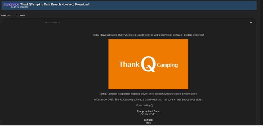 The CYFIRMA Research team has observed claims made by a threat actor identified as “888,” who alleges responsibility for a cybersecurity breach involving ThankQCamping. ThankQCamping is a well-known camping service platform in South Korea, reportedly serving over one million users nationwide. According to the threat actor, the incident took place in December 2025.