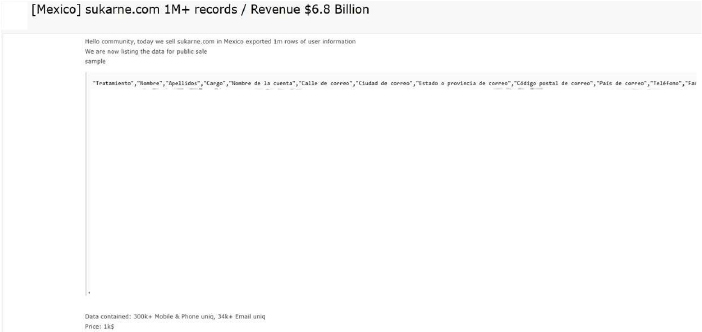 The CYFIRMA Research team observed that SuKarne, a Mexican multinational corporation and a major player in the global meat processing industry with reported revenues of $6.8 billion, has allegedly been compromised. A threat actor attempting to sell data on a dark web forum claims to have exported a database containing over 1 million rows of user and business information. The dataset is currently listed for sale for $1,000.