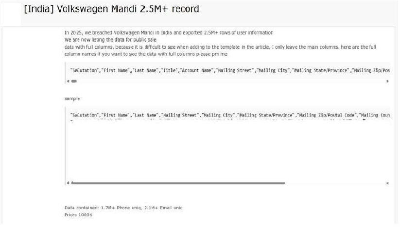 The CYFIRMA Research team has identified claims from a threat actor alleging a data breach involving Volkswagen Mandi, which the actor describes as the target of a cyber incident in December 2025. The claim was posted on a cybercrime forum, where the threat actor asserts that a large database was exfiltrated from the affected entity. Although the actor explicitly references “Volkswagen Mandi”— potentially pointing to a dealership located in Mandi, Himachal Pradesh, or an internally labeled database—the breadth of the sample data raises concerns of a much wider impact. Data samples reportedly contain addresses from multiple Indian states, including Maharashtra, Tamil Nadu, Madhya Pradesh, and Kerala, indicating that the breach may involve a centralized CRM or lead management system connected to Volkswagen operations across India.