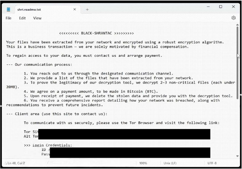 The appearance of Black Shrantac ‘s ransom note (shrt.readme.txt) (Source: Surface Web)