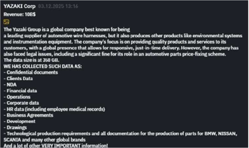 CYFIRMA observed in an underground forum that a company from Japan, YAZAKI Corp (https[:]//www[.]yazaki-group[.]com/), was compromised by INC Ransomware. The Yazaki Group is a global company best known for being a leading supplier of automotive wire harnesses, but it also produces other products like environmental systems and instrumentation equipment. The compromised dataset includes a wide range of sensitive information, such as confidential documents, client data, non-disclosure agreements (NDAs), financial and operational records, corporate and HR data (including employee medical records), business agreements, development materials, technical drawings, technological production requirements, and complete documentation related to the manufacturing of parts for various clients. The total volume of exposed data is estimated to be approximately 350 GB.