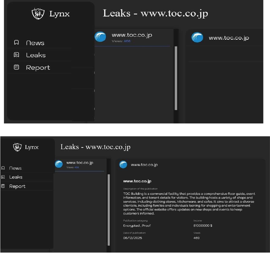 CYFIRMA observed in an underground forum that a company from Japan, TOC Co., Ltd (www[.]toc[.]co[.]jp), was compromised by Lynx Ransomware. The TOC Building is a commercial facility that provides a comprehensive floor guide, event information, and tenant details for visitors. The building hosts a variety of shops and services, including clothing stores, kitchenware, and cafes. It aims to attract a diverse clientele, including families and individuals looking for shopping and entertainment options. The compromised data contains confidential and sensitive information belonging to the organization.