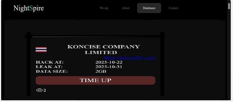 Recently, we observed that NightSpire Ransomware attacked and published the data of the KONCISE COMPANY LIMITED (https[:]//koncise01[.]com/) on its dark web website. KONCISE COMPANY LIMITED is a company primarily operating in Thailand, specializing in design, construction, and project development services for hotels, resorts, hospitals, and large-scale commercial buildings. The data leak, following the ransomware attack, encompasses sensitive and confidential records originating from the organizational database. The total size of the data compromised is approximately 2 GB.