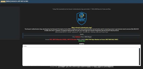 The CYFIRMA Research team observed that a threat actor claims to have breached the National Informatics Centre (NIC), India’s government technology agency. The breach specifically targets the Kavach Authentication App, a two-factor authentication (2FA) tool developed by the NIC for securing access to government email services (like NIC/GOV) and other IT systems. The actor claims to have stolen 1.7 million records.