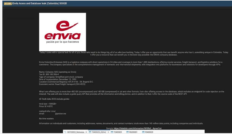The CYFIRMA Research team observed that a threat actor claims to have breached and stolen data from Envía, a major Colombian logistics company operated by Colvanes SAS. Envía is a prominent logistics and courier service specialising in freight transport and e-commerce solutions, with operations across more than 1,400 destinations.