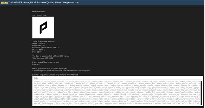 The CYFIRMA Research team observed that a threat actor “AgSlowly” claims to have breached Pruksa Holding Public Company Limited (PSH), one of Thailand’s largest real estate developers. The actor is advertising a database for sale that allegedly originates from the company’s website, pruksa[.]com.