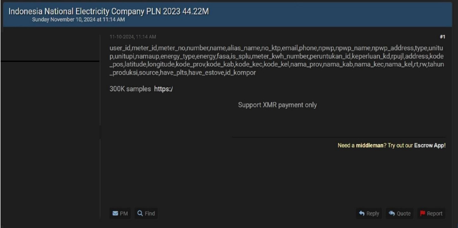 An extensive dataset from Indonesia’s National Electricity Company, PLN, has reportedly been leaked, encompassing over 44 million records. The exposed data includes sensitive information, such as user IDs, meter numbers, aliases, national ID numbers (KTP), email addresses, phone numbers, taxpayer numbers (NPWP), unit types, energy consumption types, meter kWh numbers, and various location details, such as province codes, district names, and GPS coordinates. This breach has raised significant privacy concerns, particularly regarding the potential misuse of personal and location data of PLN customers. The data breach has been attributed to a threat actor identified as “Cedar”.