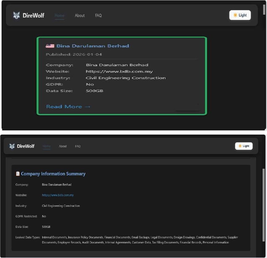 Recently, we observed that Dire Wolf Ransomware attacked and published the data of Bina Darulaman Berhad (https [:]//www[.]bdb[.]com[.]my) on its dark web website. Bina Darulaman Berhad (BDB) is a Malaysian investment holding company listed on Bursa Malaysia (KLSE: BDB) focused on property development, construction, leisure, and sustainability initiatives. The ransomware incident resulted in the compromise of approximately 500 GB of data, encompassing Internal Documents, Insurance Policy Documents, Financial Documents, Email Backups, Legal Documents, Design Drawings, Confidential Documents, Supplier Documents, Employee Records, Audit Documents, Internal Agreements, Customer Data, Tax Filing Documents, Financial Records, and Personal Information.