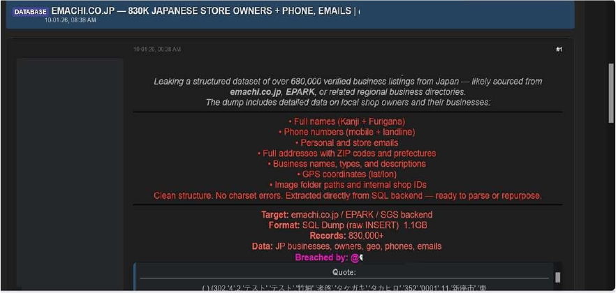 The threat actor claims the compromised dataset contains extensive business and owner information related to Japanese local enterprises.