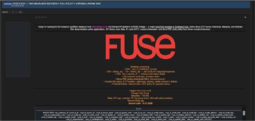 The CYFIRMA Research team has observed claims made by a threat actor using the alias “Solonik,” who alleges responsibility for a security breach involving the FUSE Group. FUSE Group (micro[.]fuse[.]co[.]id) is a prominent InsurTech provider in Southeast Asia, operating since 2017 with a presence across Indonesia, Malaysia, and Vietnam. According to the actor, the breach resulted in the exfiltration of sensitive data from the Simas Insurtech backend, including insurance policy applications, API activity logs, loan information, customer identification records, and direct links to policy documents in PDF format.