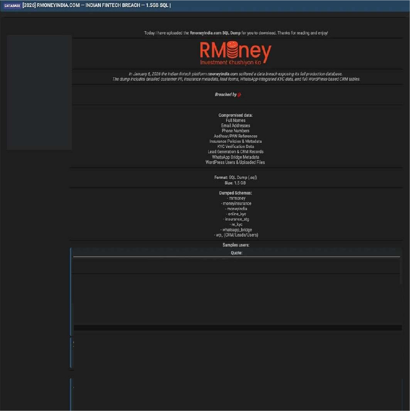 The CYFIRMA Research team observed that Rmoney India, an Indian fintech platform, has allegedly been compromised in a significant data security incident. On January 8, 2026, the organization was listed on a dark web forum by a threat actor who claims to have exfiltrated the company’s full production database. The breach reportedly involves a 1.5GB SQL dump encompassing multiple schemas, including insurance data, online KYC records, and WhatsApp bridge integrations.