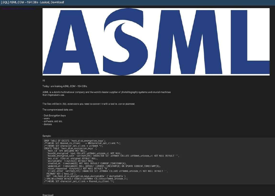 The CYFIRMA Research team has identified that ASML, a Dutch multinational corporation and the world’s leading supplier of photolithography systems and critical equipment for the semiconductor industry, has allegedly been the target of a significant data leak. A threat actor on a cybercrime forum claims to have published approximately 154 databases belonging to the technology giant. The leaked files, which are reportedly in SQL format, were posted for download with instructions on how to convert them for viewing.