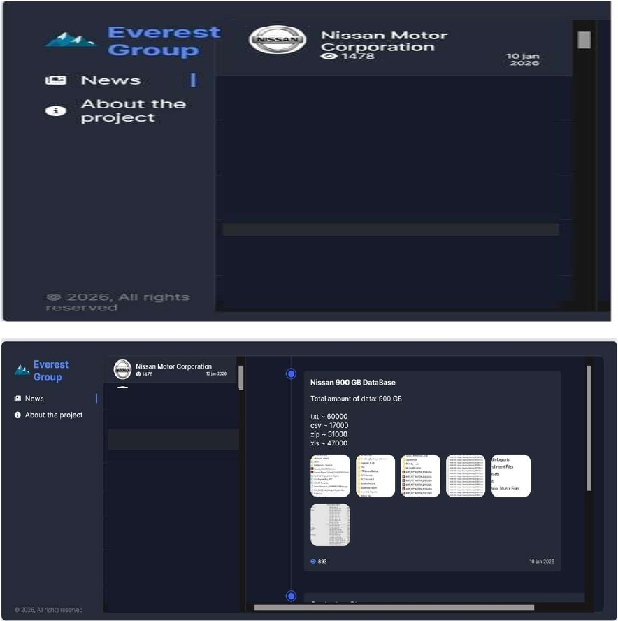 CYFIRMA observed in an underground forum that a company from Japan, Nissan Motor Corporation (https[:]//www[.]nissan-global[.]com/), was compromised by Everest Ransomware. Nissan Motor Corporation is a multinational automobile manufacturer headquartered in Yokohama, Japan. The company, founded in 1933, produces a comprehensive range of vehicles, from luxury cars to commercial trucks. Nissan is known for its innovation in electric and autonomous driving technology. It includes brands like Infiniti and Datsun. It also has partnerships with Renault and Mitsubishi. The compromised data includes internal documents such as blueprints, financial records, and other sensitive materials, totaling 900 gigabytes of files.