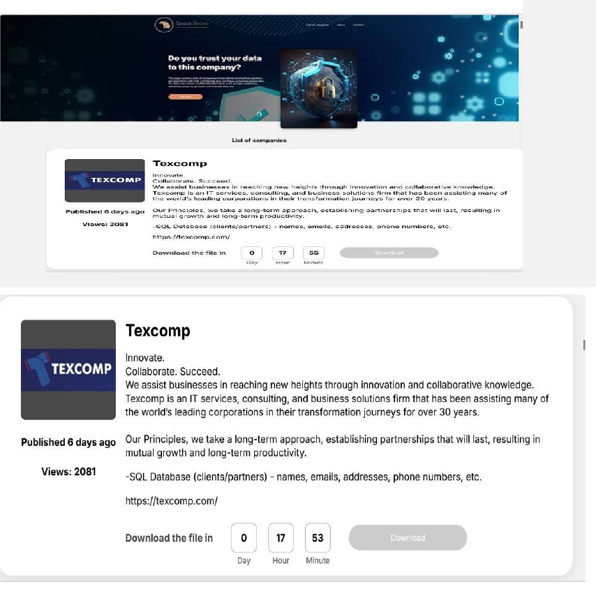 Recently, we observed that Space Bears Ransomware attacked and published the data of Texcomp(https[:]//texcomp[.]com/) on its dark web website. Texcomp is an IT services, consulting, and business solutions company that helps organizations adopt modern technology to enhance efficiency, automation, and digital transformation. It provides a range of software products and technology solutions for businesses across multiple industries. The ransomware incident led to the exposure of an SQL database containing client and partner information, including names, email addresses, physical addresses, phone numbers, and other related contact details.