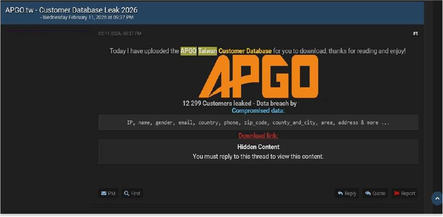 The CYFIRMA research team identified that APGO Taiwan, a retailer specializing in automotive coating and detailing products, has allegedly been compromised. A threat actor “k0rb3nd4ll4s” has claimed to leak a database containing customer information on a cybercrime forum. The leak reportedly occurred in 2026, with the actor offering the data for download to the community.