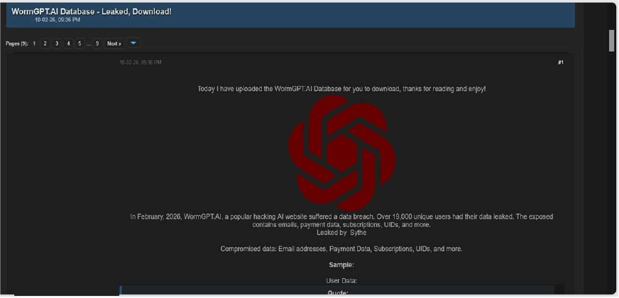 The CYFIRMA Research team observed that WormGPT.AI, a platform known for offering uncensored artificial intelligence models for hacking purposes, has allegedly been compromised. Detailed records belonging to the site’s user base were posted on a cybercrime forum by an actor who claims to have uploaded the full database for public download. The leak reportedly affects over 19,000 unique users who utilized the service in February 2026.