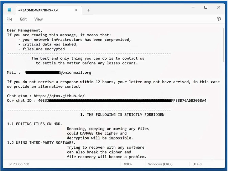 The appearance of the Ndm448 ransom note (+README-WARNING+.txt) (Source: Surface Web)