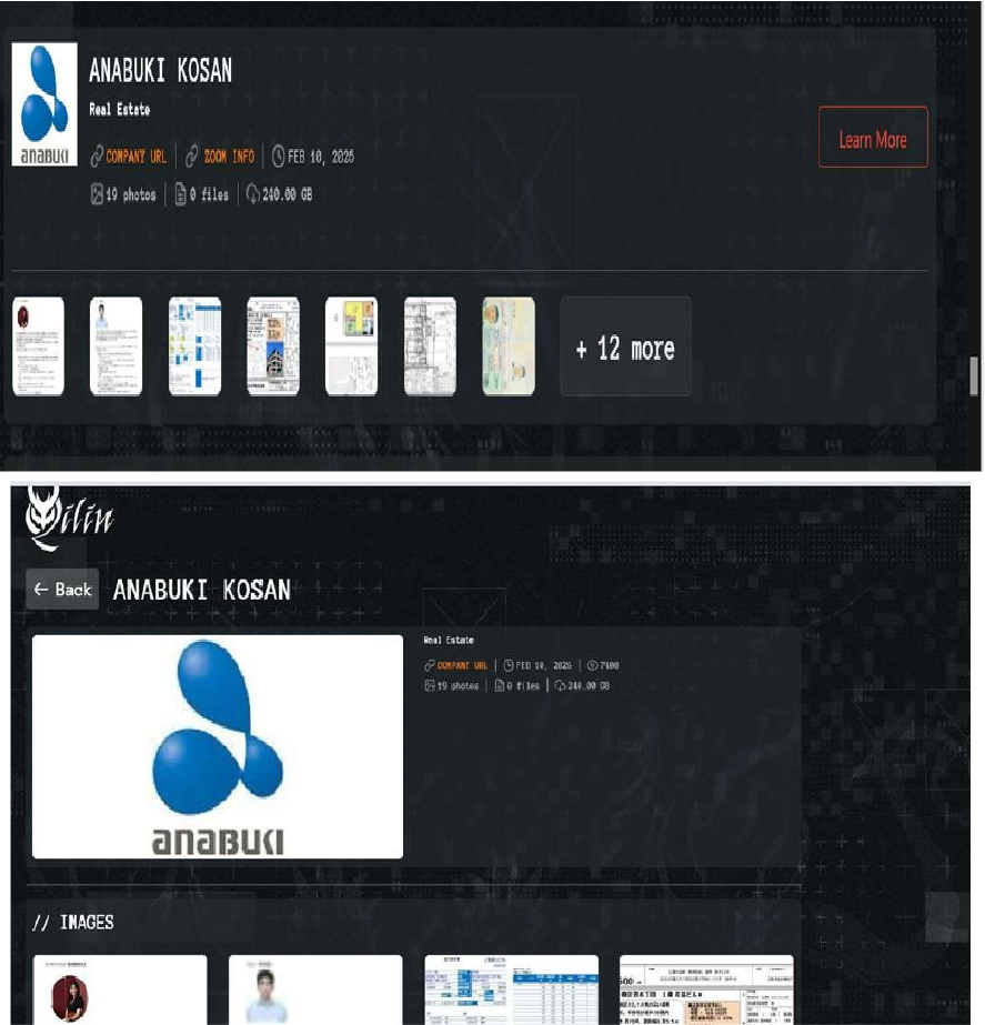 CYFIRMA observed in an underground forum that a company from Japan, Anabuki Kosan Inc (https[:]//www[.]anabuki[.]ne[.]jp/), was compromised by Qilin Ransomware. Anabuki Kosan Inc. is a leading real estate company in Japan focused primarily on condominium development and comprehensive property-related services. It is a core member of the broader Anabuki Group, which operates across multiple sectors, including real estate, renewable energy, senior care, and other lifestyle services both in Japan and internationally. According to the screenshot from the ransomware group’s website, the attack appears to have led to the exposure of several categories of highly sensitive information. The leaked content includes personally identifiable information (PII) such as full names, photographs, dates of birth, gender, residential addresses, and contact details displayed on identification documents. Multiple thumbnails show government-issued ID cards and passport-style documents, suggesting that official identity records were compromised. In addition, the presence of structured spreadsheets and tabulated documents indicates that employee records, payroll data, financial statements, and other internal administrative files may have been disclosed. Architectural floor plans and technical drawings are also visible, pointing to the exposure of operational and infrastructure-related documents. Overall, the breach appears to involve extensive personal, financial, and organizational data, with the total volume of compromised information estimated at approximately 240 GB.