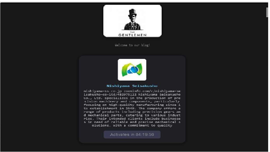 CYFIRMA observed in an underground forum that a company from Japan, Nishiyama Seisakusho Ltd(https[:]//www[.]nishiyama-ss[.]co[.]jp/), was compromised by the Gentlemen Ransomware. Nishiyama Seisakusho Co., Ltd. specializes in the production of precision machinery and components, particularly focusing on high- quality manufacturing. The company offers a range of products, including precision gears and mechanical parts, catering to various industries. The data, which has been breached, has not yet appeared on the leak site, indicating that negotiations between the affected party and the ransomware group may be underway. The compromised data includes confidential and sensitive information belonging to the organization.