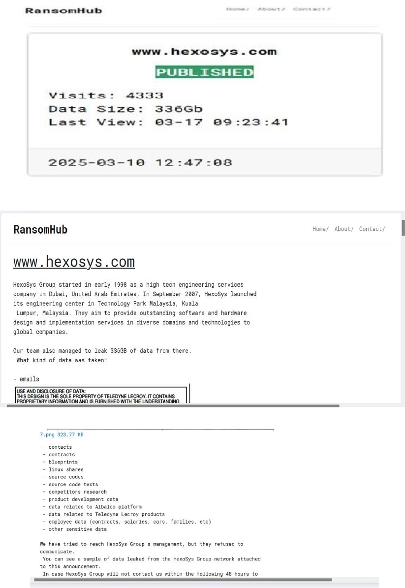 From the External Threat Landscape Management (ETLM) Perspective, CYFIRMA observed in an underground forum that a company from Malaysia; HexoSys Group (www[.]hexosys[.]com) was compromised by RansomHub Ransomware. HexoSys is a technology company specializing in providing engineering services to high-tech industries. The company has over two decades of experience in delivering cutting-edge solutions in software development, FPGA (Field-Programmable Gate Array) design and implementation, and firmware design. The compromised data contains contracts, blueprints, Linux shares, source codes, source code tests, competitors’ research, product development data, employee data (contracts, salaries, cars, families, etc), and other sensitive data. The total size of the compromised data is approximately 336 GB.