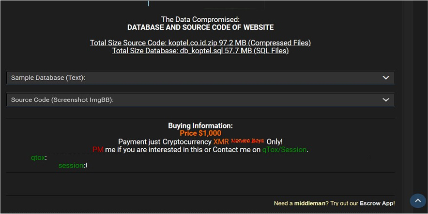 The CYFIRMA Research team observed a data sale related to the KOPTEL Telkom Cooperative Indonesia(https[:]//koptel[.]co[.]id/) in an underground forum. KOPTEL (Koperasi Telekomunikasi) is a secondary cooperative under the auspices of PT. Telkom Indonesia. It serves as a secondary cooperative within PT. Telkom Indonesia, with members comprising KOPEGTEL cooperatives across Indonesia. The compromised data includes the website’s database and source code. The source code has a total size of 97.2 MB, while the database, stored in SQL format, is 57.7 MB. The data is being offered for sale at a price of $1,000. The breach has been linked to a threat actor identified as “Lord Voldemort.”