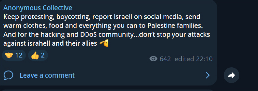 This Anonymous Collective message from Telegram calls for continued attacks against Israel and its supporters.