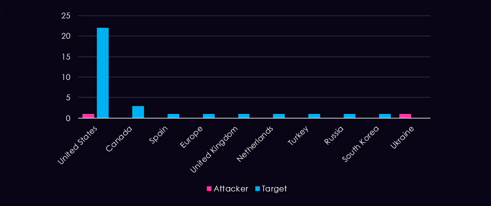 The United States accounted for 22 of 28 victim identifications, with Canada (3 incidents) and isolated cases across Europe, the Middle East, and Asia. Attacking country was rarely identified, with only the United States and Ukraine appearing once each.