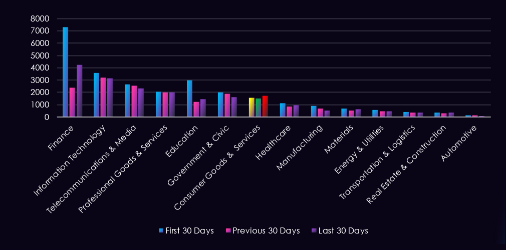Over the past 90 days, CYFIRMA’s telemetry has identified 4,753 mentions of the consumer goods & services industry out of a total of 63,998 industry-linked mentions. This is from a total of 300k+ posts across various underground and dark web channels and forums.