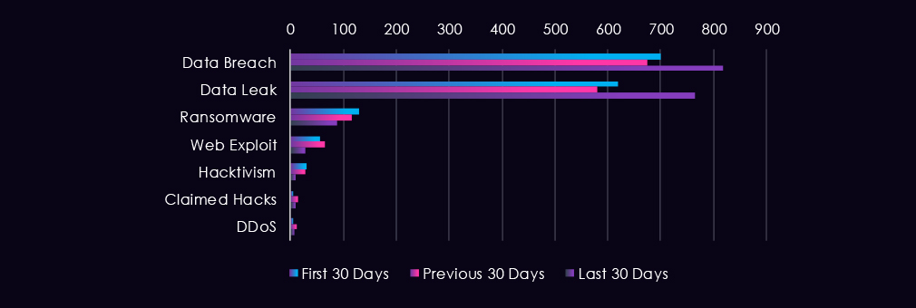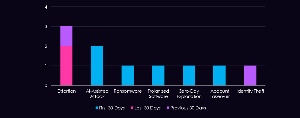 Extortion was the most frequently observed technique (3 incidents), concentrated in the previous and last 30-day periods. AI-assisted attacks appeared twice in the first 30 days, representing early experimentation with this emerging attack method.