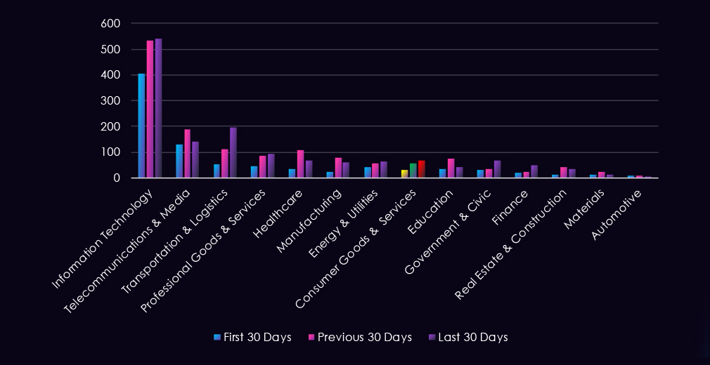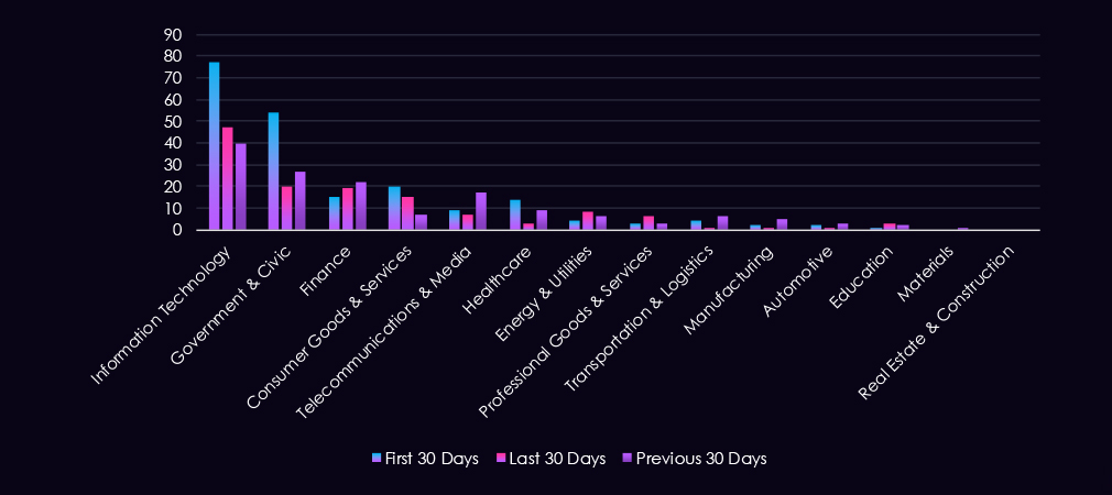 130 → 115 → 89. Consistent decline across all periods. Ransomware targeting of the consumer goods & services sector is decreasing, potentially reflecting lower perceived return on investment compared to other sectors or shifts in attacker priorities.