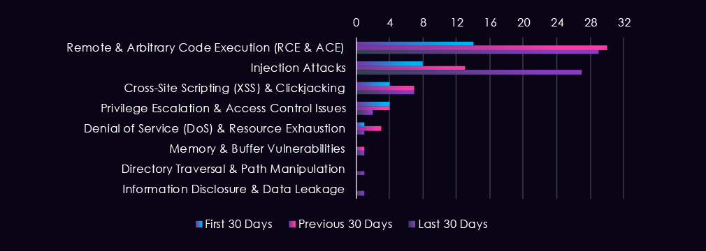 Reported CVEs over the last 90 days show elevated activity in code execution and injection vulnerabilities. Remote and arbitrary code execution vulnerabilities spike mid-period and remain consistently high, while injection attacks show a sharp increase in the final period, more than tripling from initial levels. Cross-site scripting vulnerabilities remain stable at modest levels. Privilege escalation and denial of service vulnerabilities show minimal activity with variable fluctuation, while directory traversal and information disclosure remain at negligible levels.