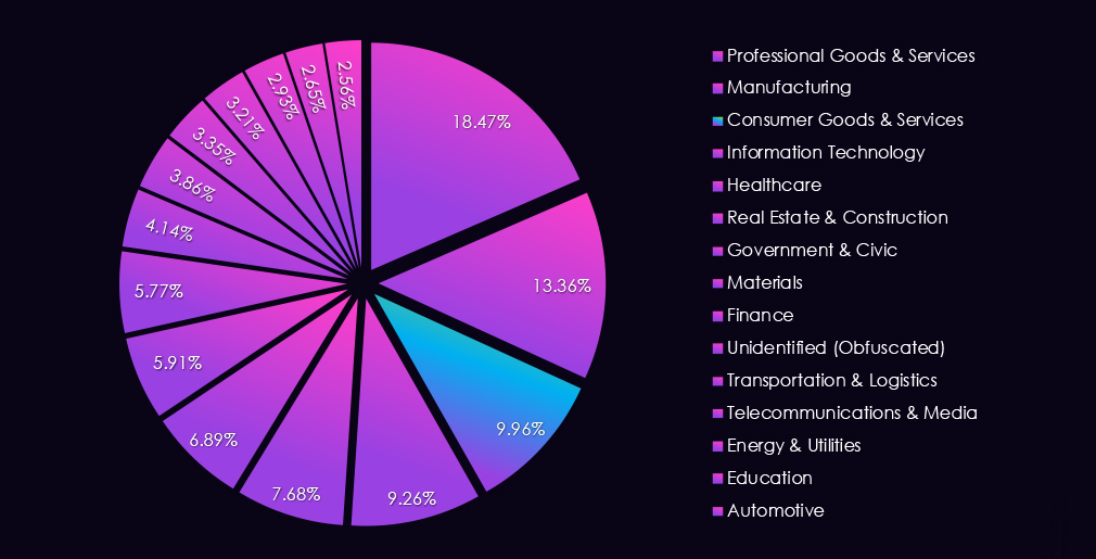 Furthermore, a quarterly comparison shows that the number of victims in the consumer goods & services industry has declined. It went from 242 to 214 victims, a -11.6% decrease. The overall interest, represented by share, also slowed from 11.45% to 9.96% of all victims.