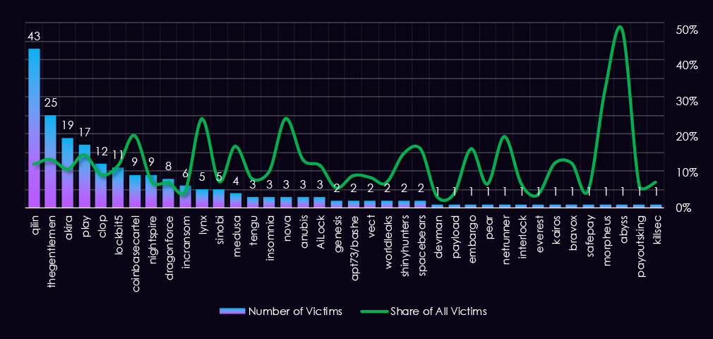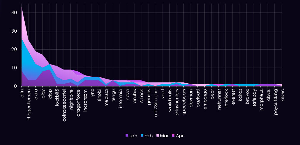 Qilin: Continuously the most active gang with 347 victims across industries in the last 90 days. 43 were from this industry (12.5%).