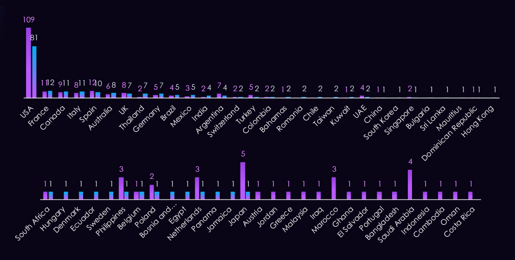 The United States was overwhelmingly targeted (22 incidents), followed by Canada (3 incidents) and isolated cases in Spain, the United Kingdom, the Netherlands, Turkey, Russia, and South Korea.