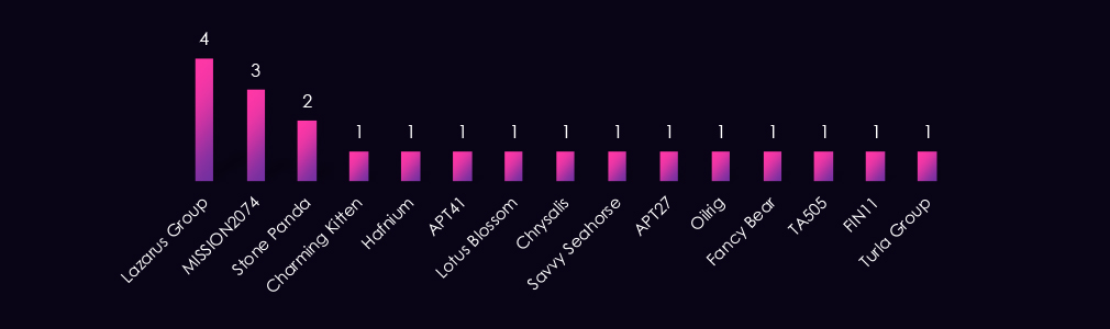 Observed APT campaigns show a broader mix of state-sponsored actors compared to other sectors this period. North Korean Lazarus Group leads, reflecting the group’s known interest in financially valuable consumer-facing targets. China-linked actors remain well represented, with MISSION2074 and Stone Panda following closely, and additionally Hafnium, APT41, Lotus Blossom, and APT27.
