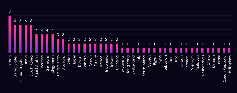 Japan leads in victim count, with the United States, United Kingdom, India, and South Korea close behind. Germany, Saudi Arabia, Thailand, and Singapore also record meaningful numbers. The Middle East shows stronger representation than in other sectors, with Saudi Arabia, UAE, Qatar, Kuwait, Bahrain, and Oman all recording victims, consistent with Iran-linked and financially motivated actor activity.