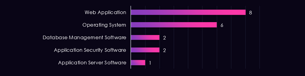 Web applications and operating systems account for the large majority of observed attacks, consistent with patterns seen across other sectors this period. Database management and application security software each recorded multiple instances, suggesting data access and attempts to undermine defensive tooling as secondary objectives.