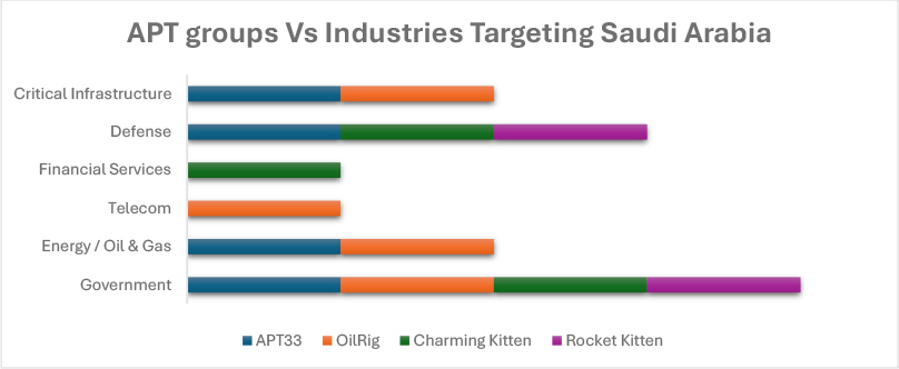 The below graph highlights a clear pattern of state-aligned cyber espionage activity concentrated primarily on government and strategic sectors. Government entities emerge as the most consistently targeted sector, with multiple Iran-linked threat actors including APT33, OilRig, Charming Kitten, and Rocket Kitten demonstrating overlapping interest in Saudi Arabian governmental institutions. The energy and oil and gas sector also shows significant targeting, particularly from APT33 and OilRig, reflecting Saudi Arabia’s strategic importance as a global energy leader.