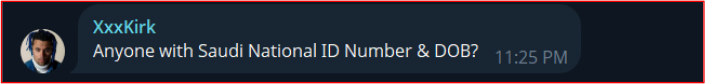 On December 11, 2025, a threat actor using an online alias was observed on an underground forum and associated messaging channels seeking access to sensitive personal data related to Saudi nationals, specifically national identification numbers and dates of birth. Although no transaction or dataset was publicly confirmed, the inquiry itself reflects active interest in acquiring high-value identity information within cybercriminal communities. Requests of this nature are commonly associated with fraud schemes, identity misuse, account takeover attempts, and other forms of downstream criminal exploitation. Even exploratory posts can signal intent, facilitate connections between buyers and sellers, and contribute to a broader ecosystem of illicit data trading.