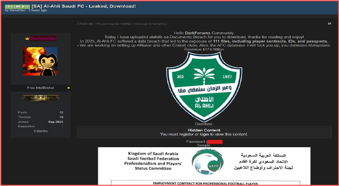 On December 17, 2025, a threat actor publicly alleged a breach involving Al-Ahli Saudi FC, claiming the exposure of more than one hundred internal documents. The purported materials were described as including contractual records, identification documents, and internal administrative files. While the authenticity of the claim remains unverified, if substantiated, such an incident would represent a significant cybersecurity and reputational risk to the organization and the wider sports sector.