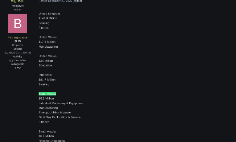 On December 20, 2025, the threat actor known as Big-Bro posted financial impact estimates related to cybercriminal activity targeting Saudi Arabia. The figures included approximately $8.1 million associated with sectors such as Industrial Machinery & Equipment, Manufacturing, Energy, Utilities & Waste, Oil & Gas Exploration & Service, and Finance. Additionally, $6.9 million was attributed to Holding Companies within the country.